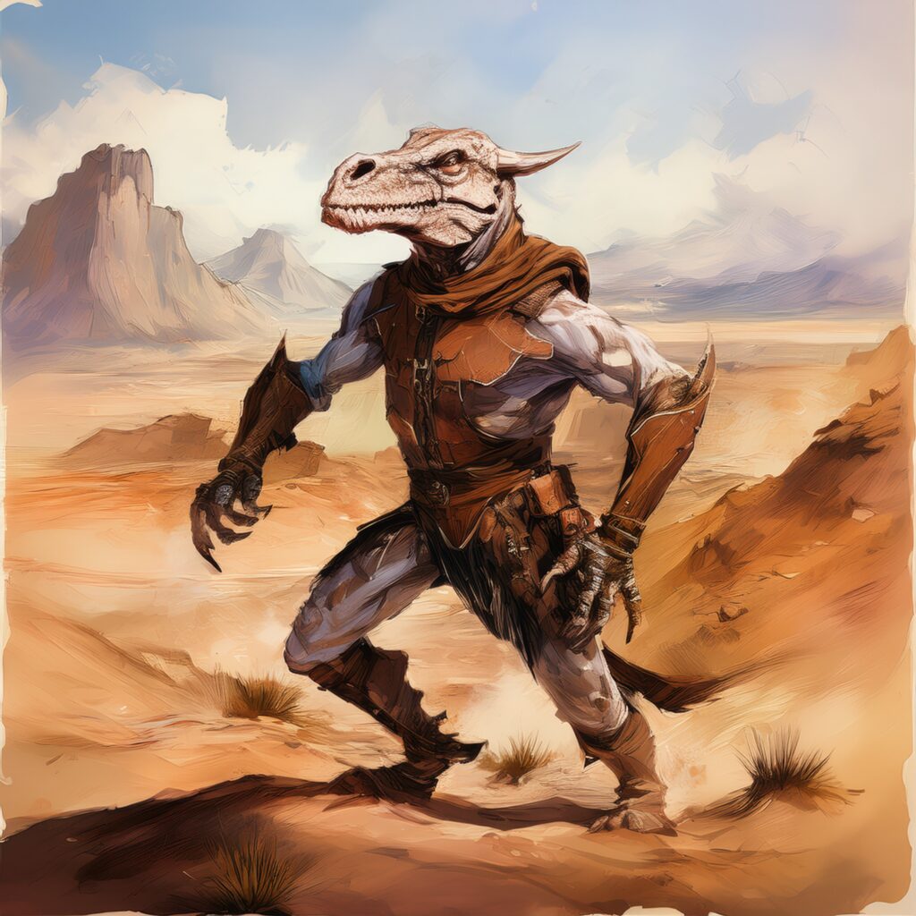 Pterrans are a reptilian race. Civilised pterrans are rarely seen in the Tablelands. They live their lives in the Hinterlands that lie beyond the Ringing Mountains, seldom leaving the safety of their villages. Other pterrans are native to the Tablelands, where they dwell in savage tribes. Less civilised than their Hinterland cousins, they are known as raiders and hunters and seldom mingle with the folk of the Seven Cities. Over time, civilised pterrans have made their way from Hinterland to Tableland and more now venture outside their homes, coming to the Tyr region to seek trade and information. Despite their varying levels of civilisation and sophistication, all pterrans revere the world of Athas as their Earth Mother, believing themselves to be her first, best children. They see the damage to Athas as the worst crimes imaginable, and many of these beings have left their homes to aid Athas in her time of need.