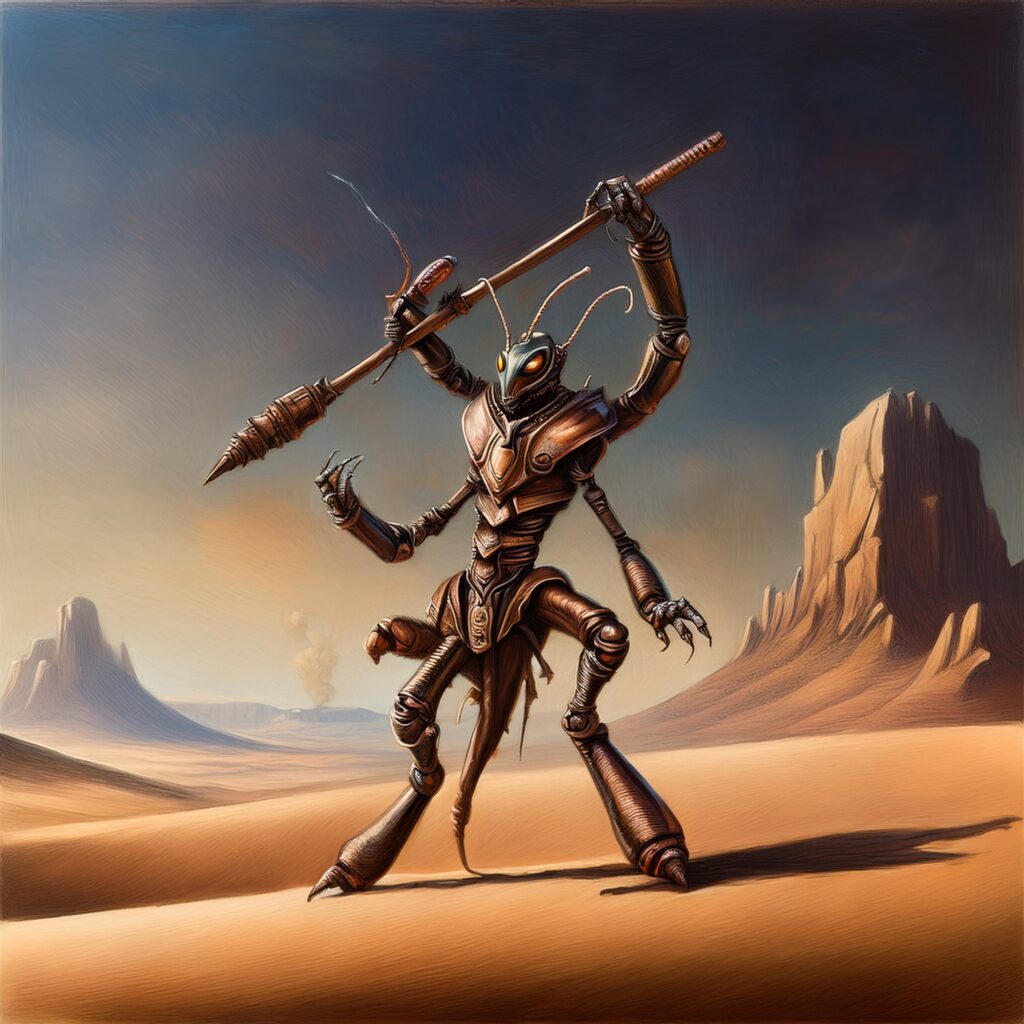 Personality: Since thri-kreen do not require sleep, they have difficulty understanding this need in the humanoid races, seeing it as “laziness” in others. Other behaviours of humanoids seem unnecessarily complex. A kreen’s life is simple: hunt prey. Kreen live for the hunt and own only what they can carry.