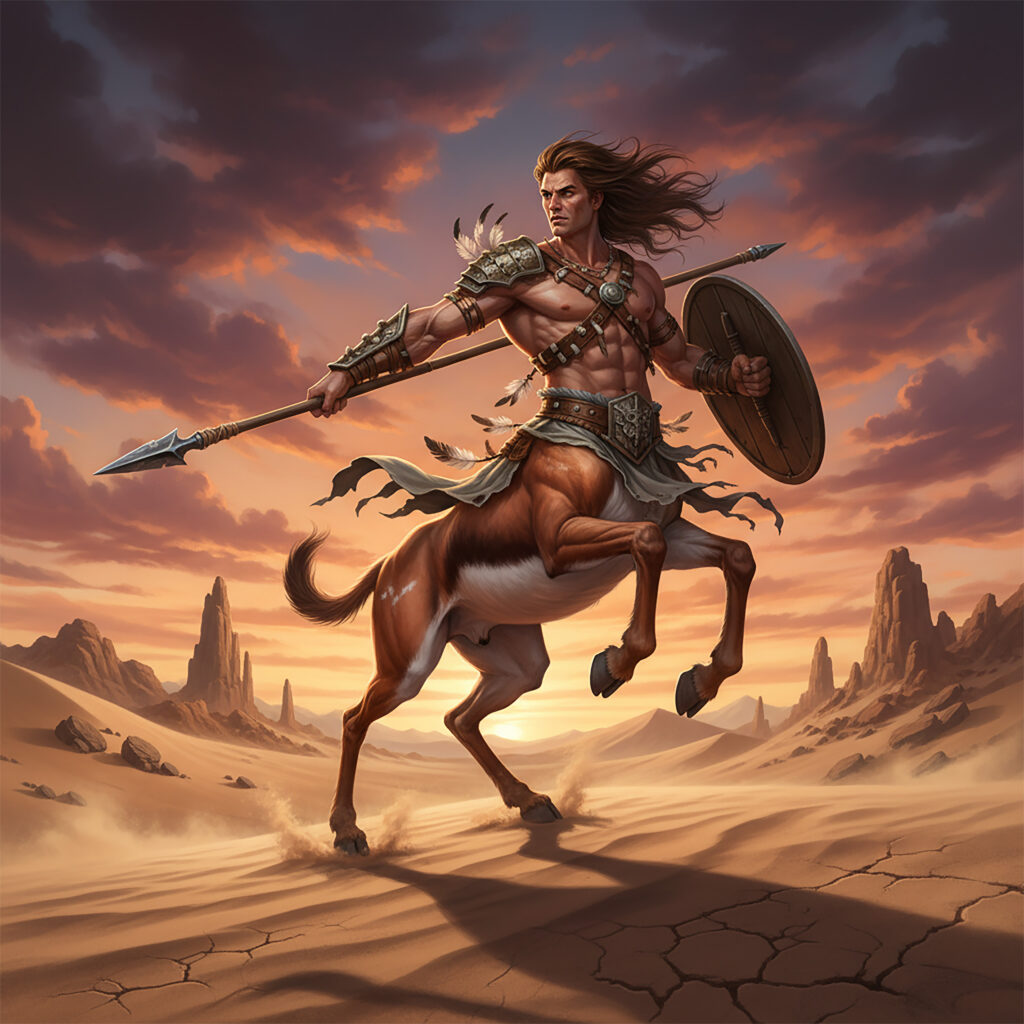 Because of the size of their antelope body, desert centaurs require half as much food and water as a typical medium-sized humanoid. Similarly, a Lapith usually doesn’t have the upper-body strength to perform free climbing or rope climbing, and would need to be hauled up or down by rope to traverse a vertical surface. Their antelope-like hooves do give them good purchase on cliffsides with any amount of rocky outcroppings, though.
