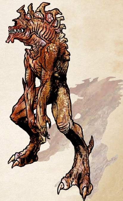 The creature before you looks like a furless ape that has been crossed with some sort of reptile. Its skull is far longer than it should be, and it does not appear to have a neck, the skull simply continuing directly into the creatures severely hunched back. The skull is not a solid piece, appearing more like a thick ribcage on top, and you can see the enormous brain that also appears to continue into the creature’s back. Long arms appear to keep it balanced, but as it stands up, you realize that they are only kept on the ground for ease of movement, and it appears more than capable of using them in a fight.