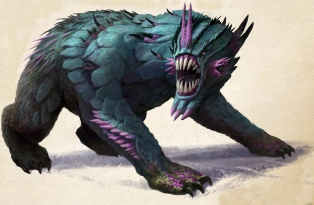 This bear-like creature has a spiked and plated exterior. It turns to look in your direction and snarls, opening its circular maw full of long, razor-sharp teeth.